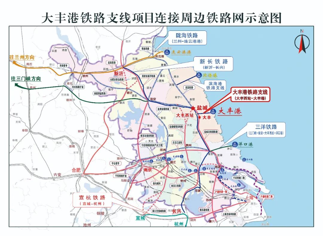 大丰港铁路支线自新长铁路大丰西站引出,途经大丰区刘庄镇、开发区、大中街道、丰华街道、沪苏集聚区、苏盐园区,终至大丰港经济开发区的大丰港站,线路全长50.6公里,桥梁占比85%,总用地规模130.35公顷。项目由上海铁路局集团南京上铁公司代建,建设工期2.5年,投资估算46亿元。